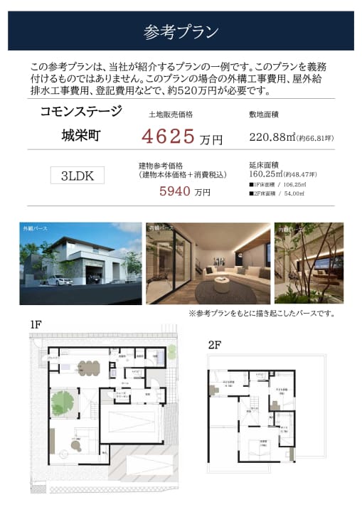 建物参考価格(建物本体価格+消費税込)5940万円/敷地面積:220.88㎡(約66.81坪)/延床面積:160.25㎡(約48.7坪)