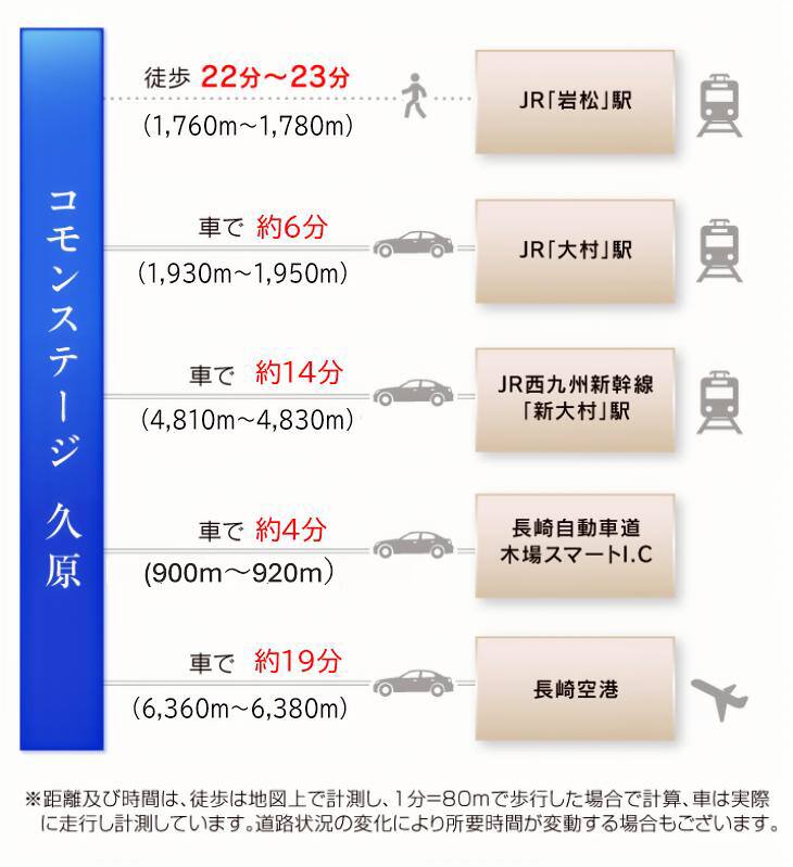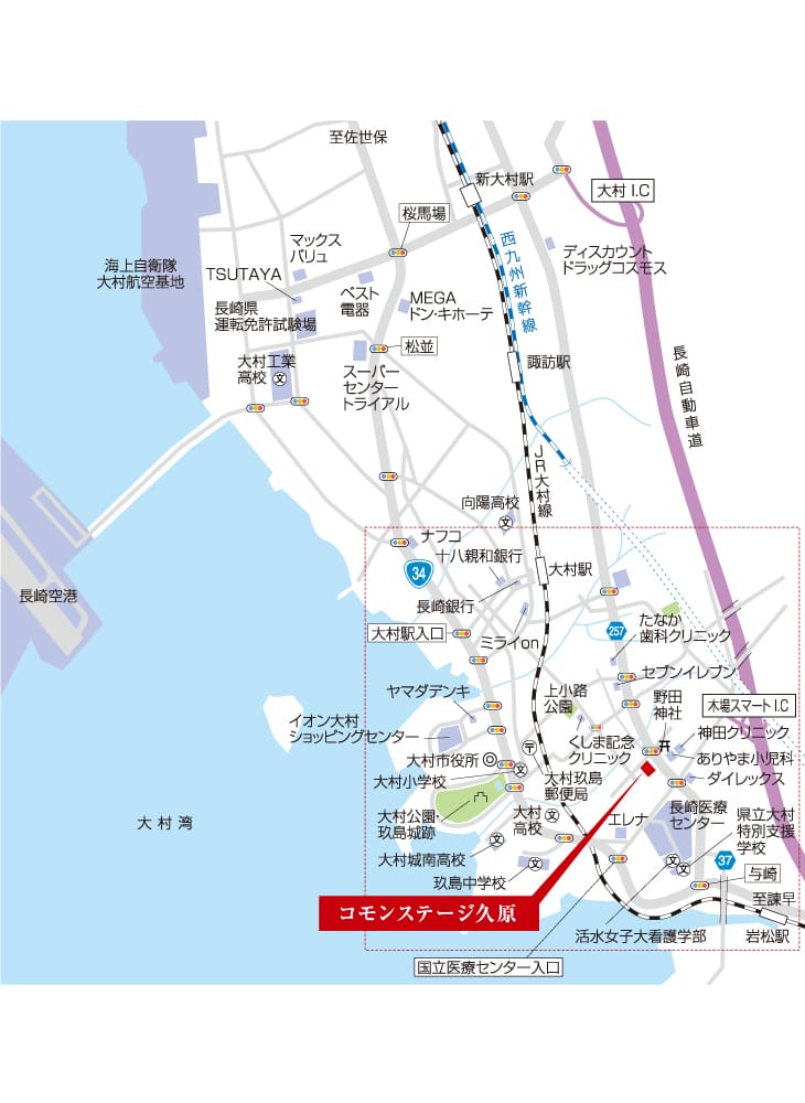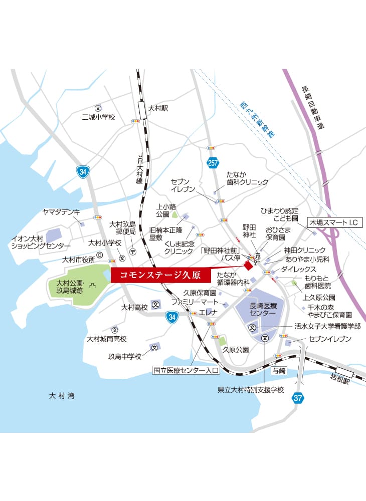 木場スマートI.C(長崎自動車道スマートI.C)まで車で約4分、JR「岩松」駅まで徒歩22〜23分、長崎空港まで車で約19分、各エリアへ便利なアクセス。大村小学校まで徒歩17〜18分、ダイレックス木場店まで徒歩4〜5分、イオン大村ショッピングセンターまで車で6分、暮らしを支える施設がある立地です。