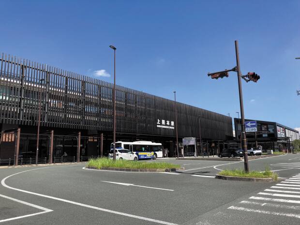 JR九州鹿児島本線と熊本市電B系統、熊本電鉄菊池線が乗り入れる駅です。2015年に新しい駅舎の供用が開始されました。「えきマチ1丁目 上熊本」という商業施設も併設。
