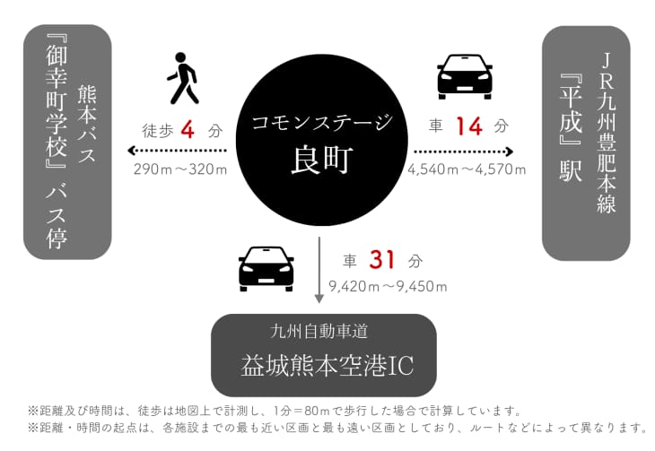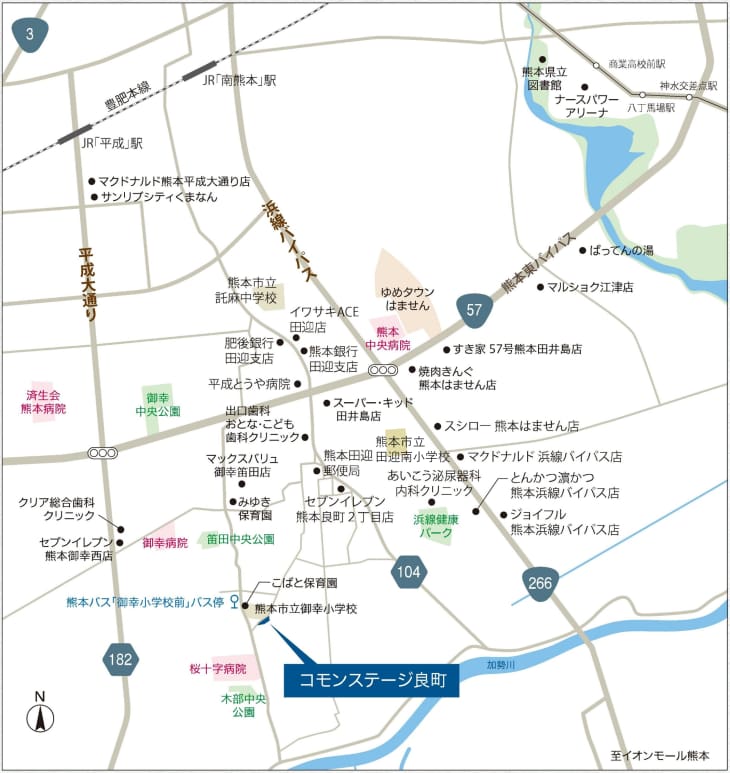 「御幸小学校前」停留所へ徒歩4分、JR九州豊肥本線「平成」駅へ車で14分。