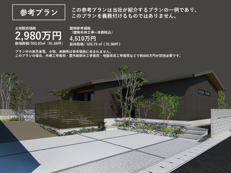土地価格2,980万円/建物参考価格(建物本体工事+消費税込)4,510万円/敷地面積303.03㎡(91.66坪)/延床面積105.75㎡(31.98坪)