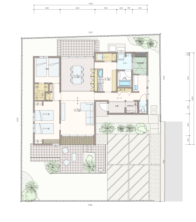 敷地面積、間口ともにゆとりがあり、駐車場や庭など余裕を持った配置計画ができます。