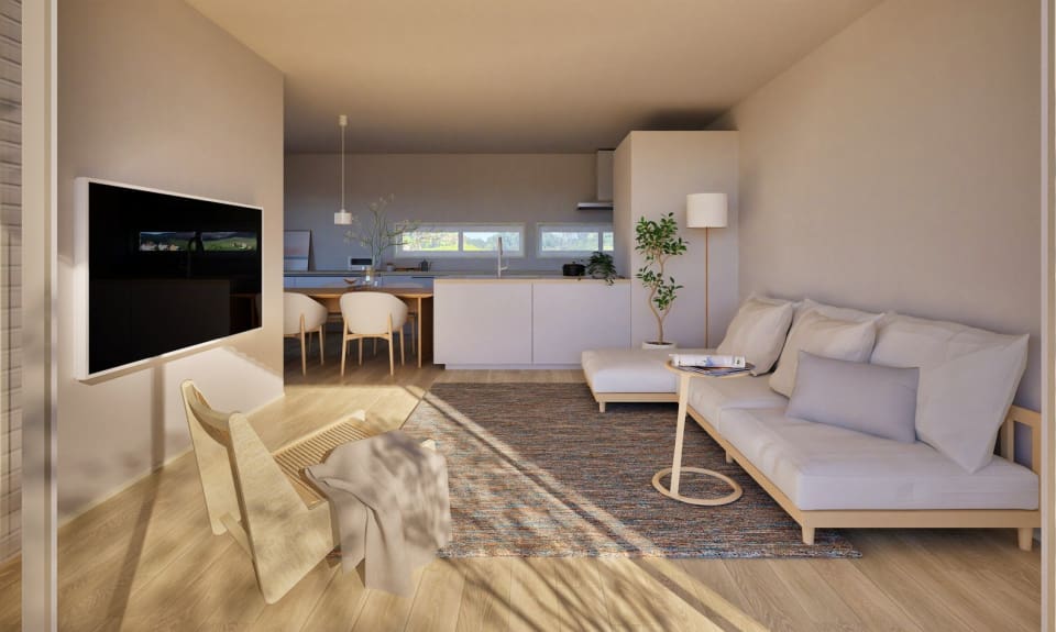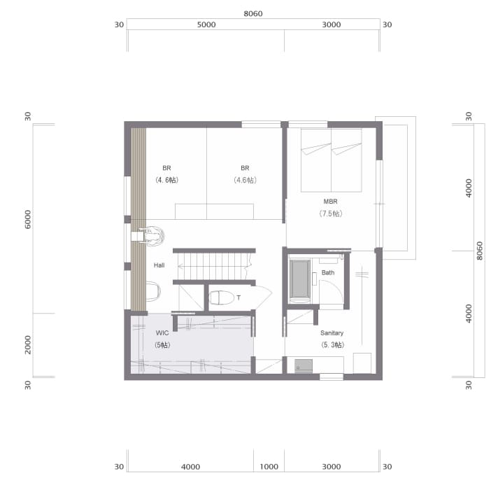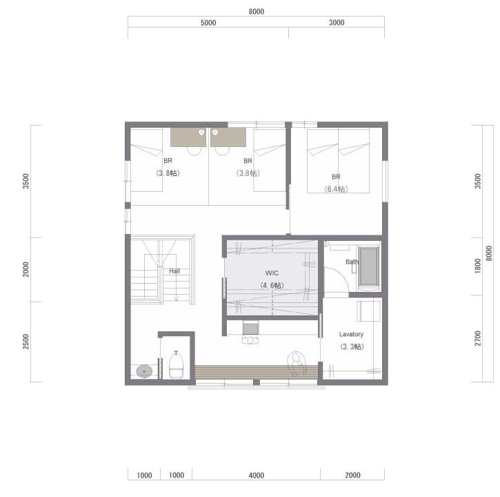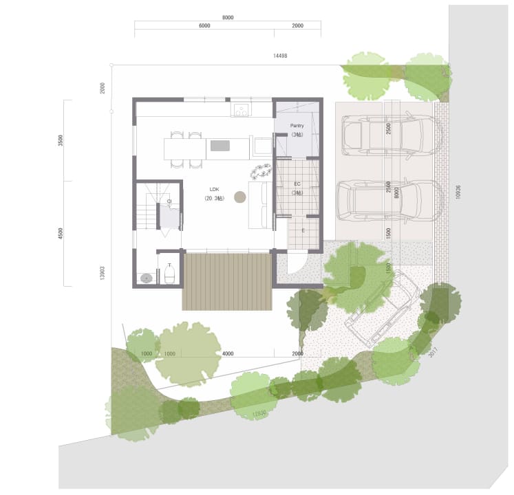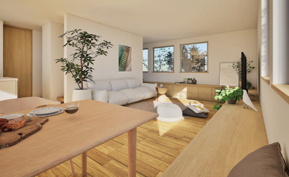 プラン中の家具家電、小物、車輌等は参考価格に含まれません。このプランの場合、外構工事費用・屋外給排水工事費用・地盤改良工事費用などで約600万円が別途必要です。参考プランをもとに描き起こしたパースです。