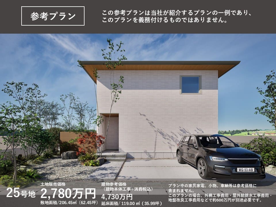 土地価格2,780万円/建物参考価格(建物本体工事+消費税込)4,730万円/敷地面積206.45㎡(62.45坪)/延床面積119.00㎡(35.99坪)