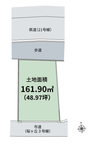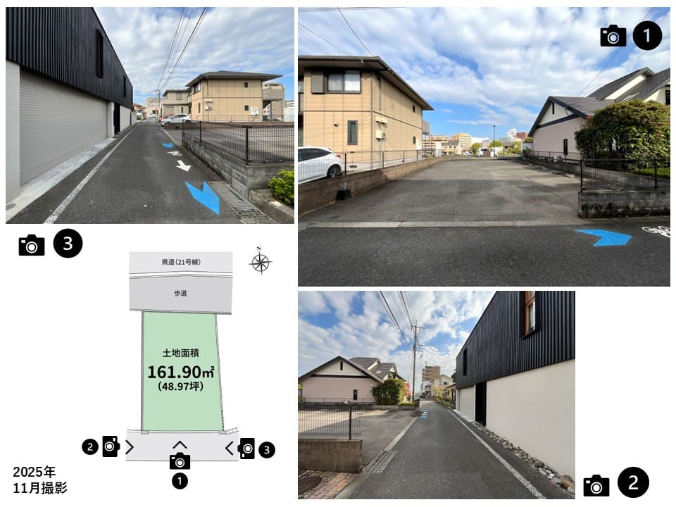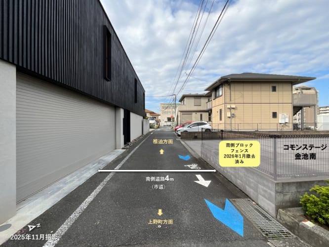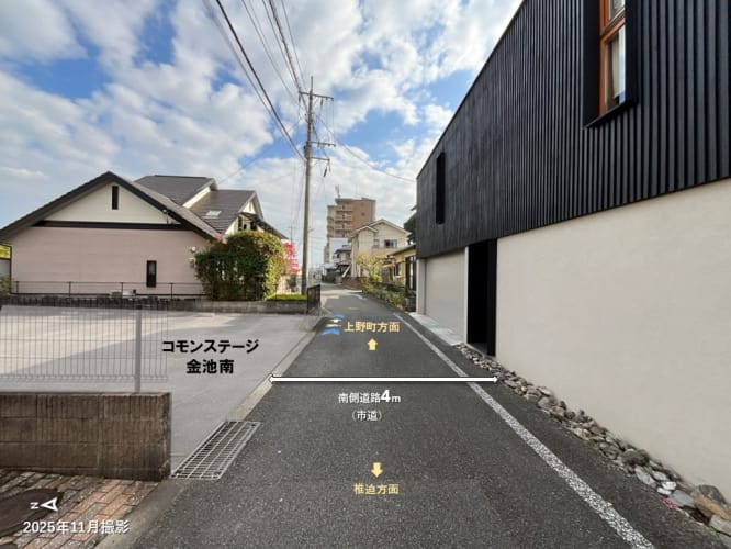 南側道路は車通りも少なく、閑静な住環境です。北側は歩道をはさんで県道に接しているので、建物の圧迫感もなく風通し、視線の抜けを感じることができます。