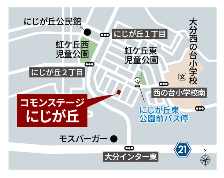 ・にじが丘東公園前バス停まで徒歩2分、東九州自動車道大分I.C.まで車で3分。