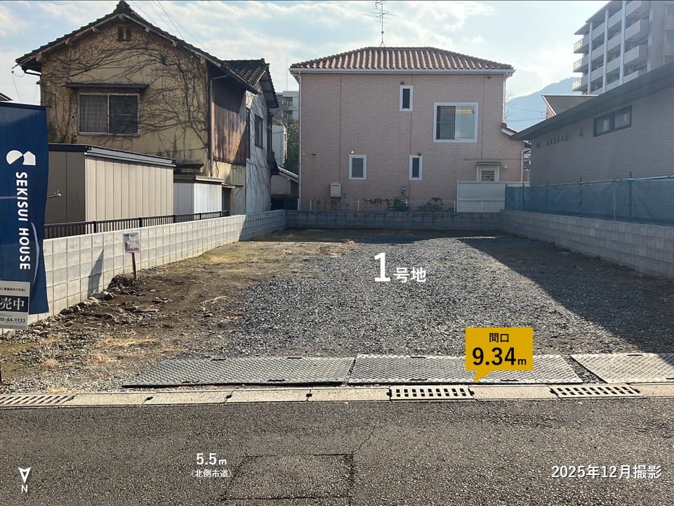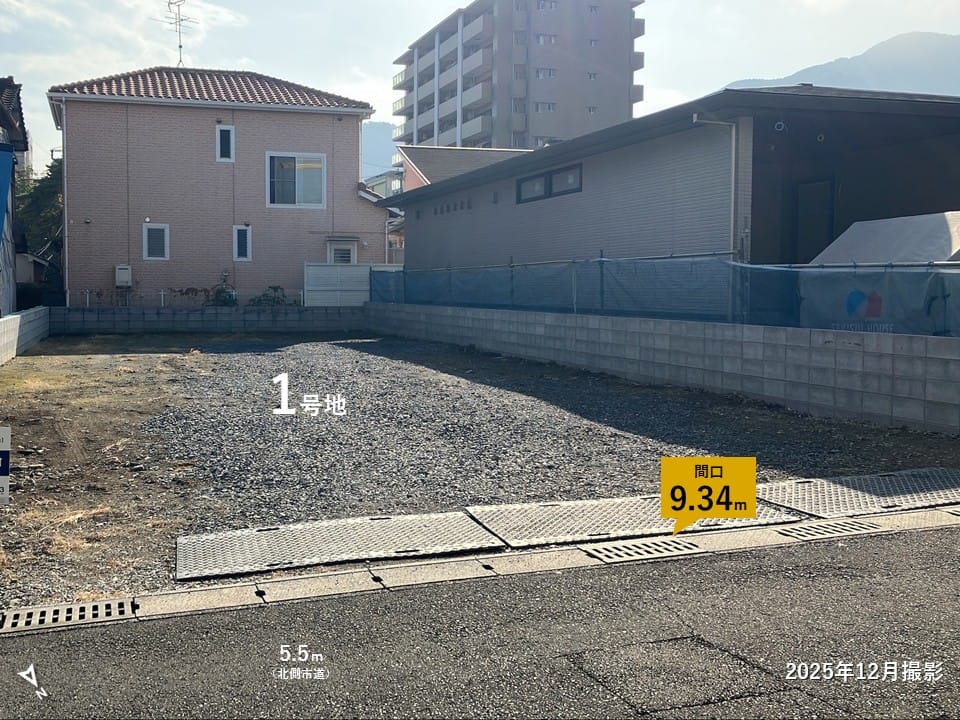 富士見通りから少し入った住宅街の中にある、落ち着いた環境の分譲地です。近くに別府公園の緑が広がり、自然を身近に感じることができます。2025年12月撮影