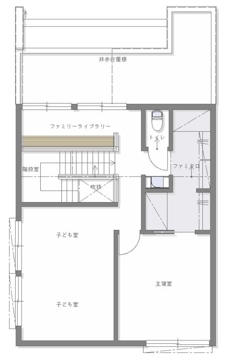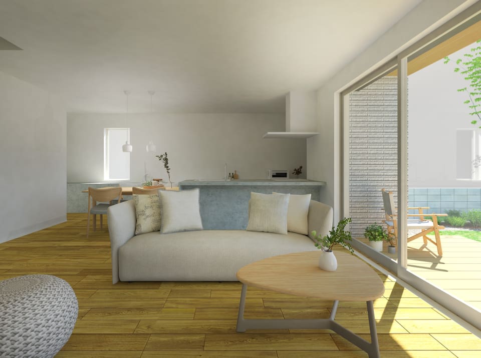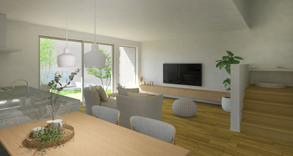 プラン中の家具家電、小物、車輌等は参考価格に含まれません。このプランの場合、外構工事費用・屋外給排水工事費用・地盤改良工事費用などで約600万円が別途必要です。参考プランをもとに描き起こしたパースです。