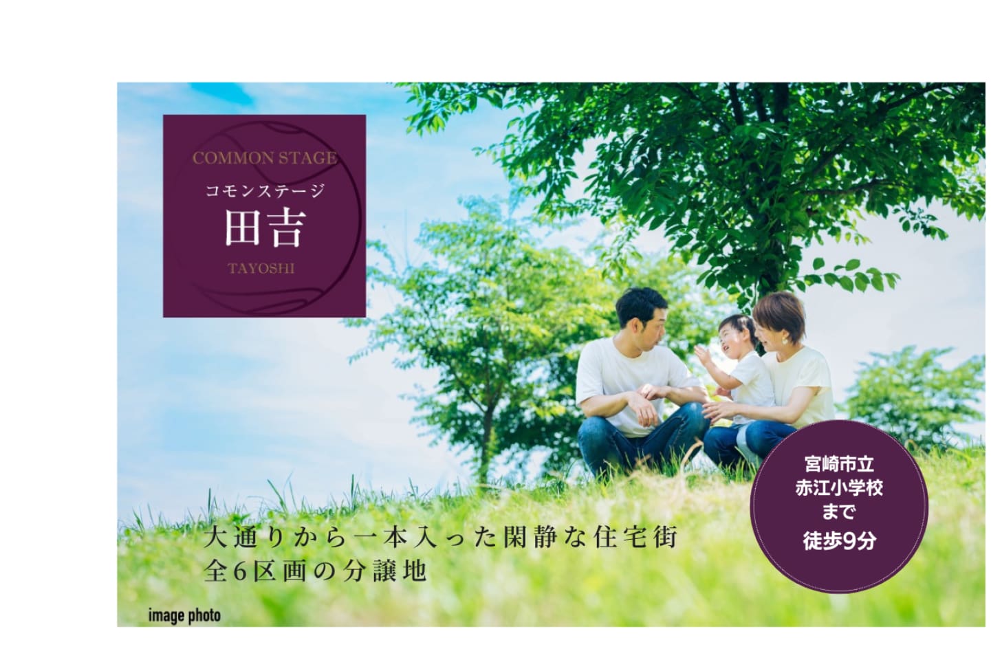 宮崎市南部、田吉駅から徒歩18分の閑静な住宅街にある積水ハウスの分譲地「コモンステージ田吉」。赤江保育園まで徒歩4分、宮崎市立赤江小学校まで徒歩9分、宮崎市立赤江東中学校まで徒歩3分と近く、お子様の通園・通学にも便利です。