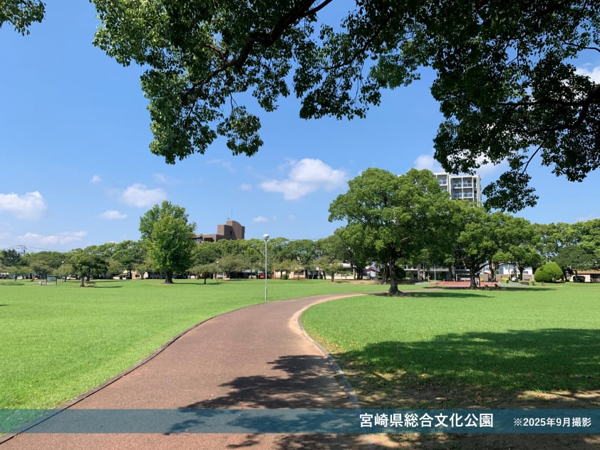 宮崎県総合文化公園は、2つの広場と3つの文化施設(美術館・図書館・芸術劇場)からなる緑豊かな文化の香り高い公園です。※2025年6月撮影