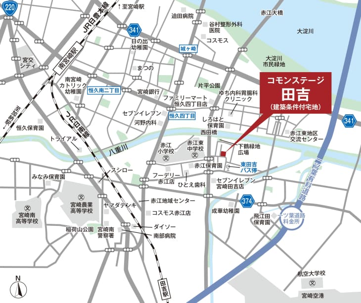 宮崎市南部、田吉駅から徒歩18分の閑静な住宅街にある積水ハウスの分譲地「コモンステージ田吉」。赤江保育園まで徒歩4分、宮崎市立赤江小学校まで徒歩9分、宮崎市立赤江東中学校まで徒歩3分と近く、お子様の通園・通学にも便利です。