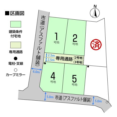 専用通路は2号地、3号地合わせて5.0mの幅員となっており、お互いに通行地役権を設定いたします。