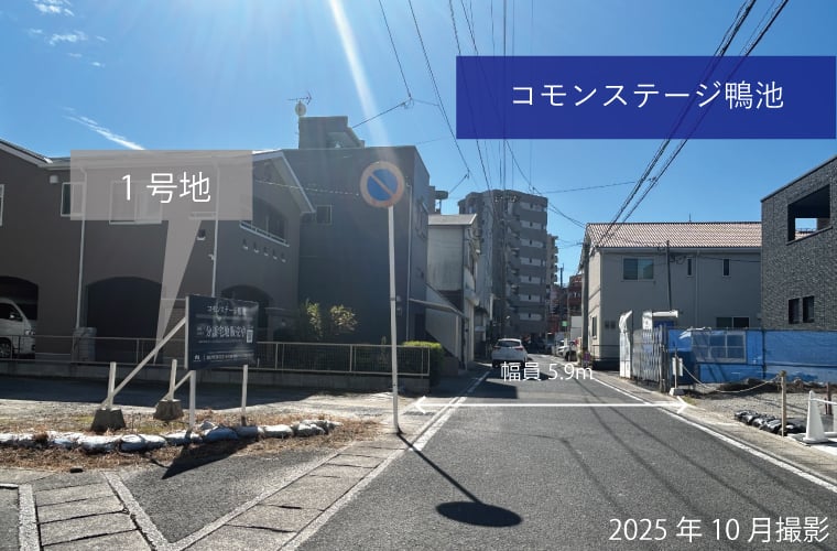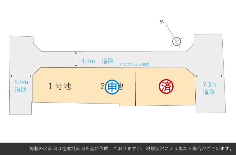 ![]() 1号地は北と西の二方向道路に面する角地です。 |