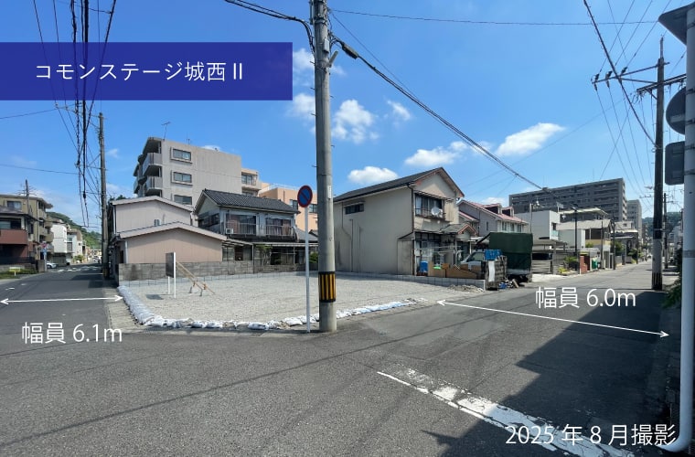 ![]() 原良小学校まで徒歩2分。6m道路に面した、南西角地の分譲地。 6.0m・6.1mの道路に面した角地です。 |
