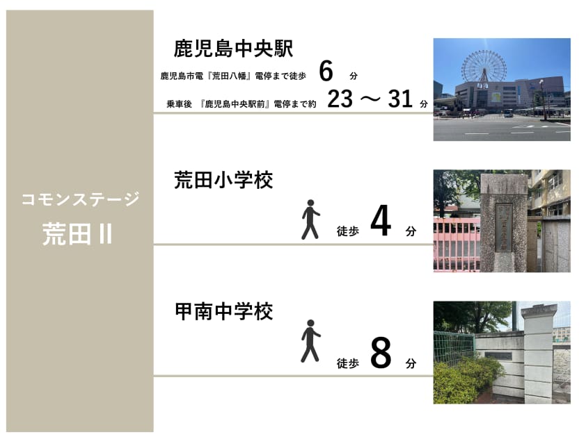 「荒田八幡」電停から乗車後、「天文館通」電停まで約12分です。「鹿児島中央駅」までは約23分~31分です。