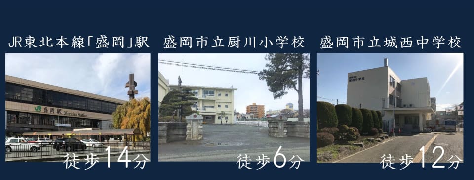 盛岡駅まで約1090m(徒歩14分)、厨川小学校まで約430m(徒歩6分)、城西中学校まで約890m(徒歩12分)、イオンタウン盛岡駅前まで約510m(徒歩7分)と生活利便施設が充実した立地です。
