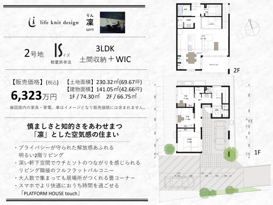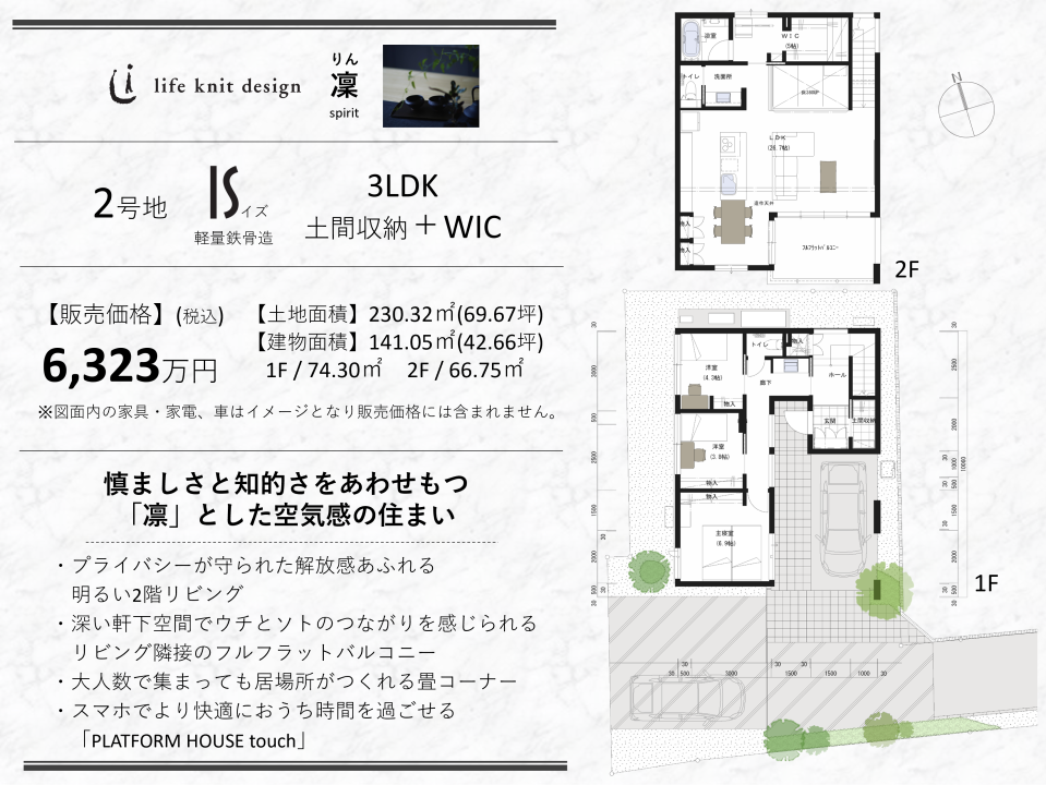 ●敷地面積/230.32㎡(約69.67坪) 延床面積/141.05㎡(約42.66坪)