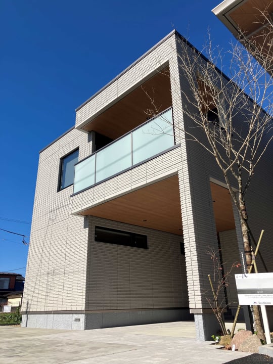 開放的かつプライベートな2階リビングの家。南側に大開口をとり、その先に軒と床が連続した6畳の大きなバルコニーを設けました。