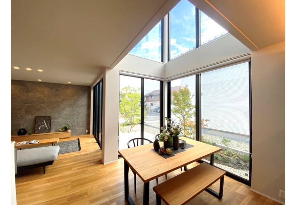 大きな吹抜けとそれに面する大開口サッシから降り注ぐ日光。