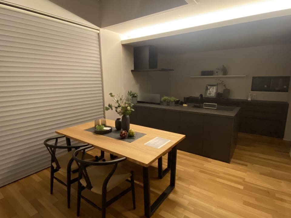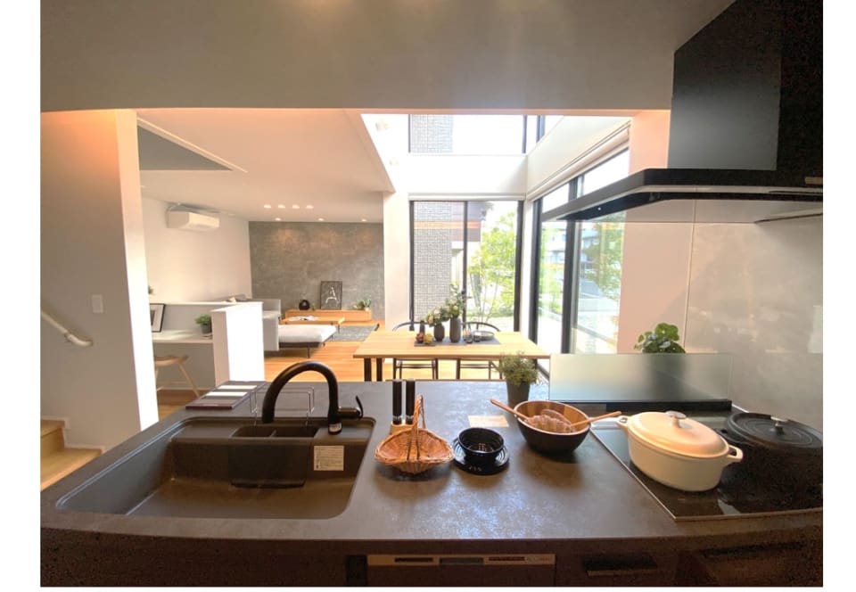 落ち着きのあるキッチン空間と、家族の笑顔あふれるダイニング空間。