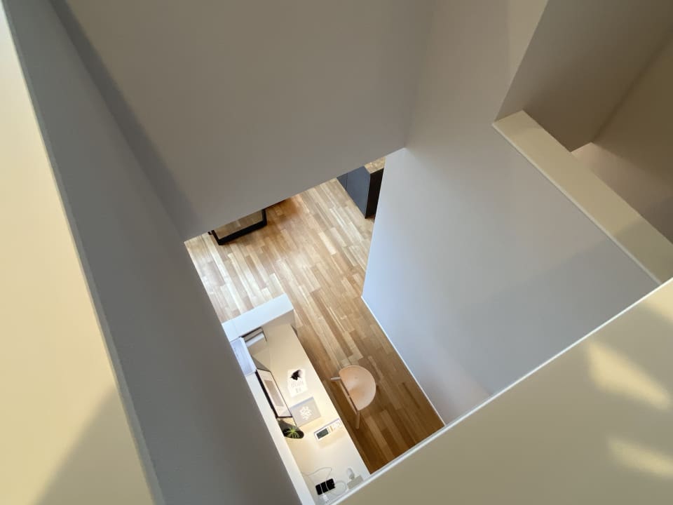 階段の吹抜けを望むと家族のいる風景。みんなが使いやすいカウンタースペース