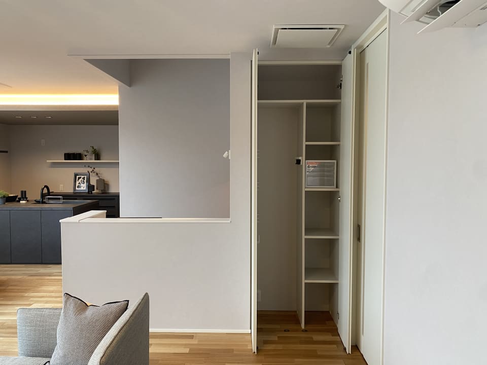 リビングの使いやすい場所に、整理しやすい棚も設置された大容量の収納。