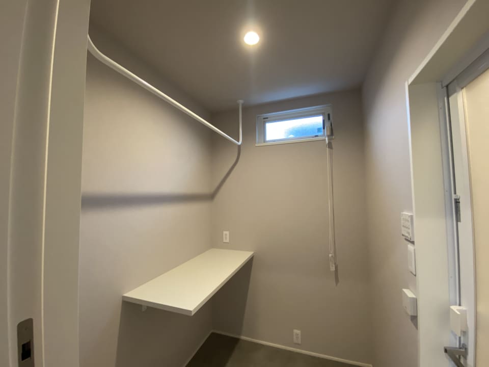 室内物干しスペースと、アイロン台スペースも完備したランドリー空間。
