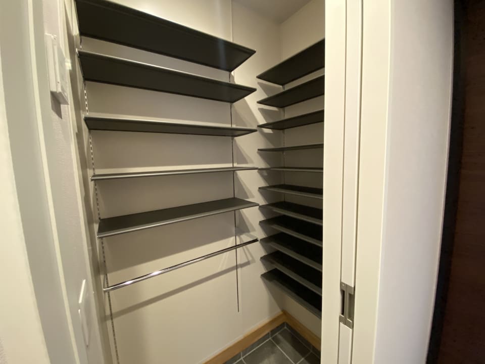 玄関脇に配置された、たくさんの棚やハンガーパイプで大容量の収納空間です。