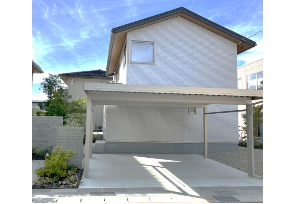 ●カーポートまで繋がる広い庭で、思い思いに遊ぶお子様を、木陰越しにリビングから眺めるご夫婦。