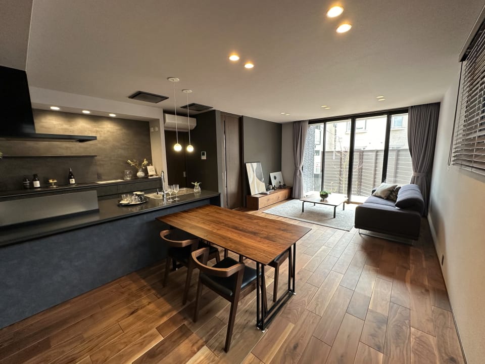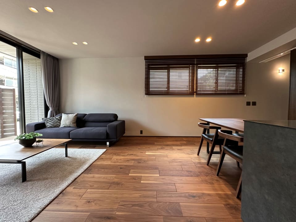 18.8帖のLDK インテリアは高級感のある落ち着いた雰囲気です。(2025年4月 ダイニングからリビング方向を向いて撮影)