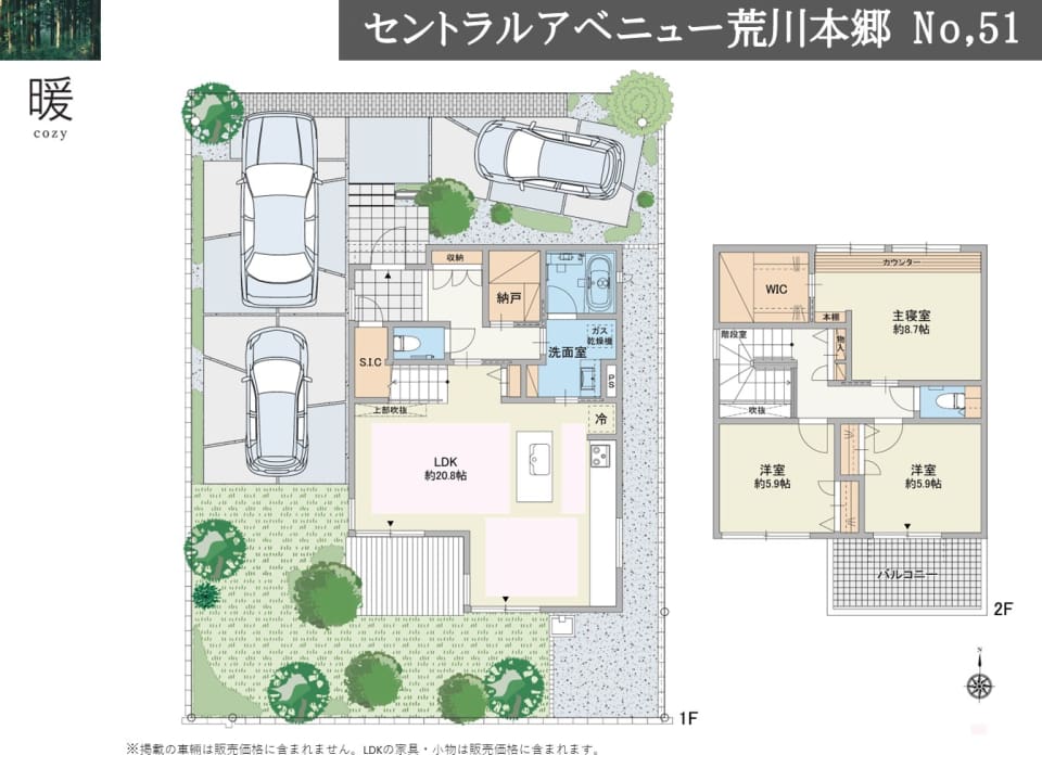※掲載のプラン・植栽等は図面を基に描き起こしたもので実際とは異なる場合があります ※LDKのソファとダイニングテーブルセット・小物等は販売価格に含まれます※車輛は販売価格には含まれません