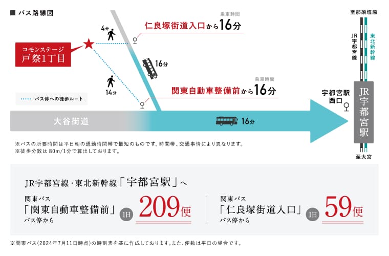 ![]() 「仁良塚街道入口」バス停へ徒歩4分(約260m〜約290m)、1日59便のバスでJR「宇都宮」駅へスムーズアクセス。 ○関東バス「関東自動車整備前」バス停/徒歩14分(約1,050m〜約1,060m) |