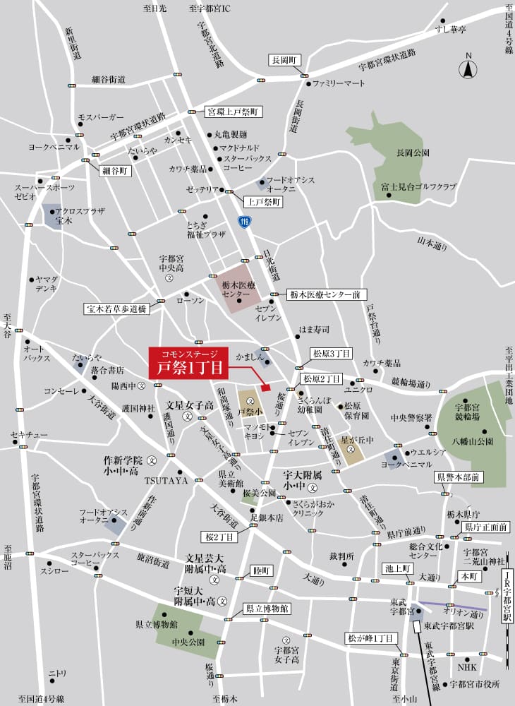 宇都宮市中心街に近い利便性とみどり豊かで穏やかなロケーション。教育施設、商業施設、医療施設が揃う暮らしやすい街「コモンステージ戸祭1丁目」内の分譲住宅