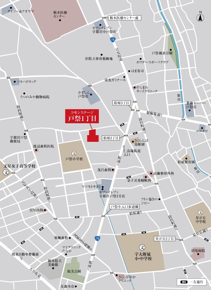 大谷街道から日光街道へ続く「桜通り」から一つ入った穏やかに暮らせる閑静な住宅街。将来性豊かなこのエリアは、駅西側の「次世代交通システムLRT」の延伸も計画されており、大通りから大谷街道への乗り入れが期待されています。公立の小・中学校はもちろん私立の小・中学校、国立の小・中学校など多くの教育施設が集まる通学も便利なエリアで、お子様の未来が広がる子育て家族が安心して暮らせるまち「コモンステージ戸祭1丁目」内の「鉄骨構造」と「木造構造」の2階建て分譲住宅です。