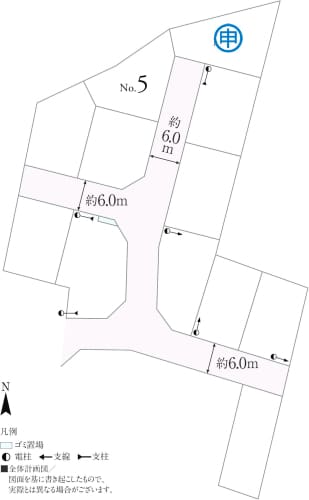 No.5は奥まった場所のためプライバシーを確保しやすい区画です。全面道路の幅は約6.0mあり、車の走行時もスムーズです。