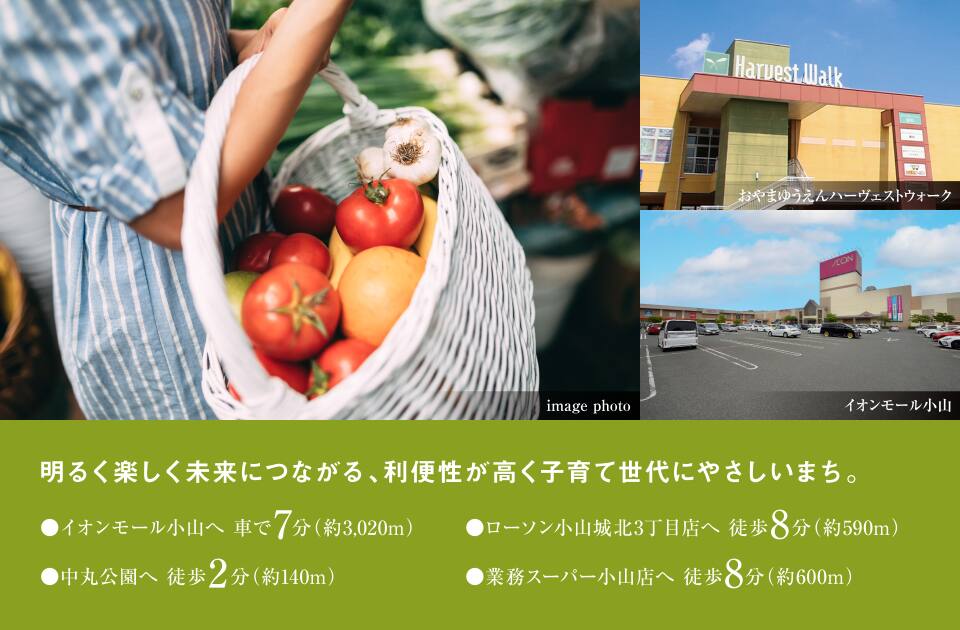 「おやまゆうえんハーヴェストウォーク」と「イオンモール小山」の2つのショッピングモールへのアクセスが良く、日常使いできるので楽しいお買い物ができます。