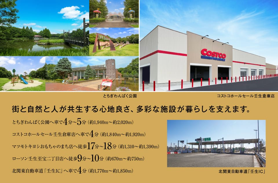 周辺には「ありんこ保育園(徒歩11分/約810m〜約860m)」や複数のスーパーや大型量販店「コストコホールセール壬生倉庫店」、ドラッグストアやコンビニなど、生活利便施設が充実しているので快適な暮らしが送れます。また、高度な医療が受けられる「獨協医科大学病院」をはじめ、充実した医療施設が近くにあり多世代が安心して暮らせるまちです。