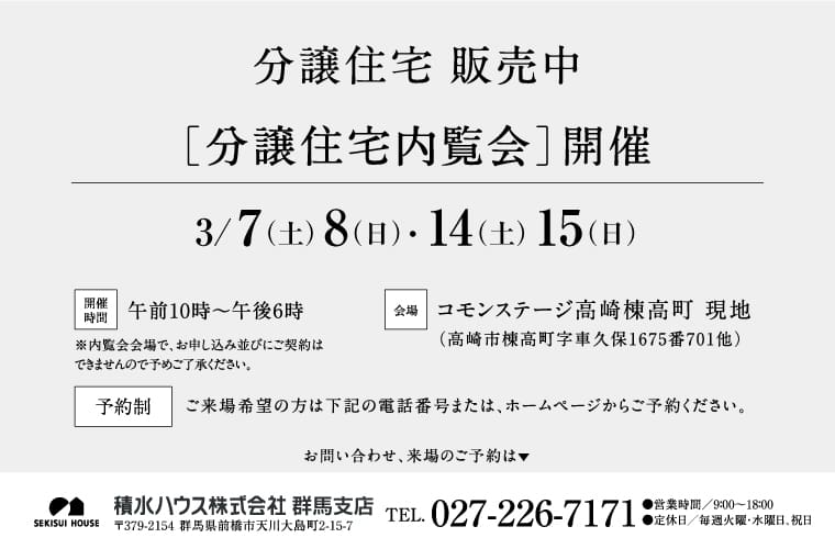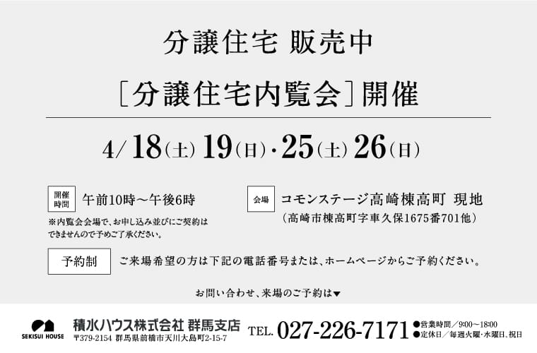積水ハウス株式会社 群馬支店定休日:火曜日、水曜日及び祝日 営業時間:9:00~18:00