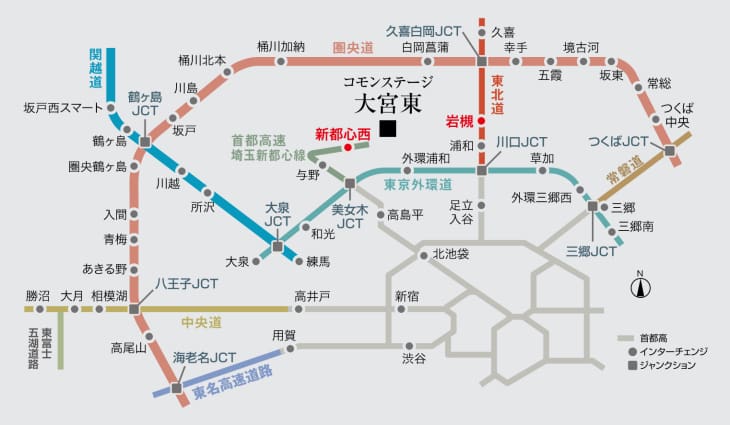 首都高速埼玉新都心線「新都心西IC」(約2950m〜約2960m)や東北道「岩槻IC」(約6550m〜約6560m)が近く、車での移動も便利。