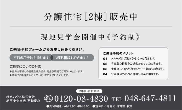 積水ハウス株式会社  埼玉中央支店定休日:火曜日、水曜日及び祝日 営業時間:9:00~18:00