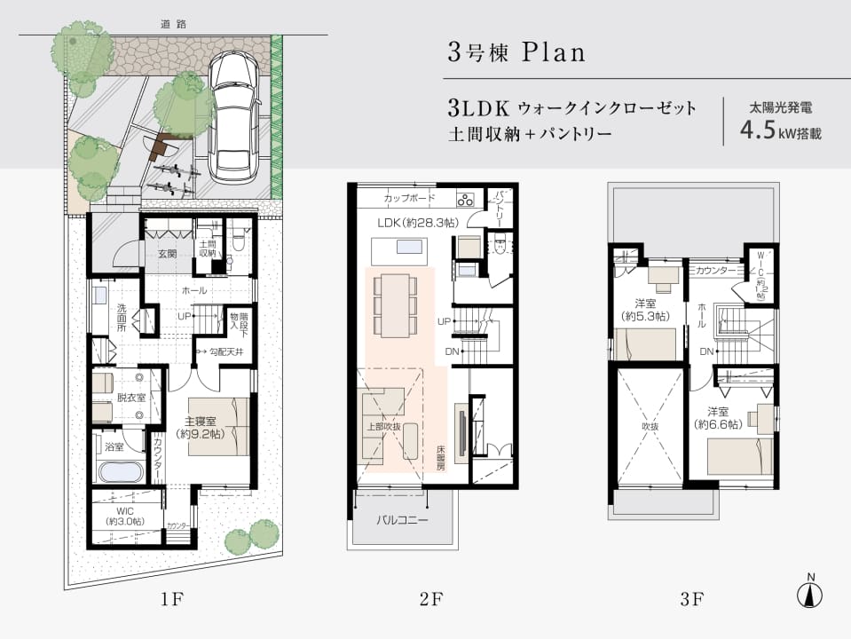 ■延床面積:149.94㎡(45.35坪) ●1階床面積:58.73㎡ ●2階床面積:58.96㎡ ●3階床面積:32.25㎡