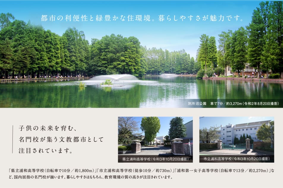 暮らしやすさが魅力のまち「浦和」、週末は豊かな緑が広がる「別所沼公園(車で7分/約3,270m)」や「北浦和公園(徒歩25分/約1,950m)」で、ジョギングや散策を楽しめます。