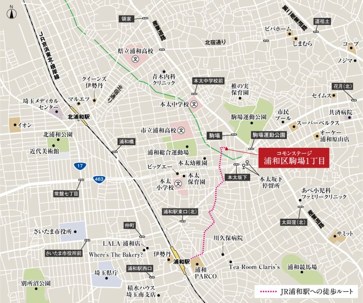 浦和駅徒歩圏のまち。徒歩5分の「本太坂下バス停」から乗車時間11〜13分で「浦和」駅へ。駅周辺には、伊勢丹浦和店 (徒歩18分/約1,420m)やシネコンもある浦和PARCO (徒歩18分/約1,400m)、アトレ浦和店(徒歩20分/約1,550m)など、大型商業施設が集積し高い利便性を誇ります。