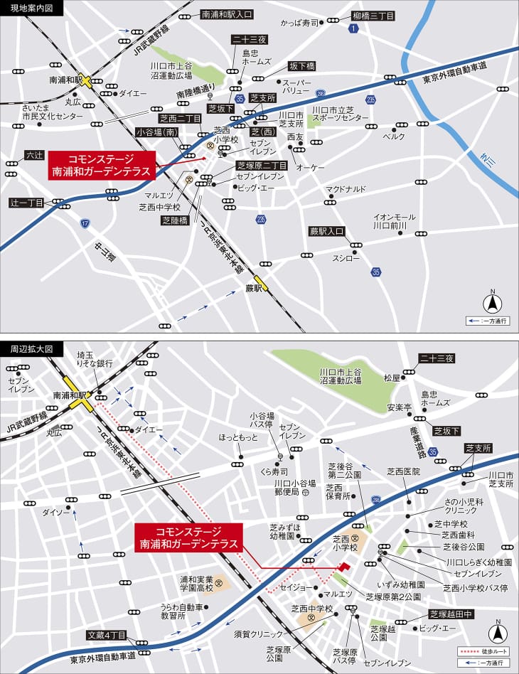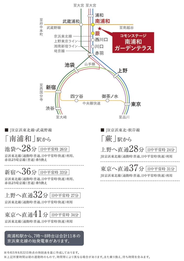 「南浦和」駅と「蕨」駅の2駅が利用できます。上野・東京へは乗り換えなしでアクセスできるので、通勤・通学もスムーズ。