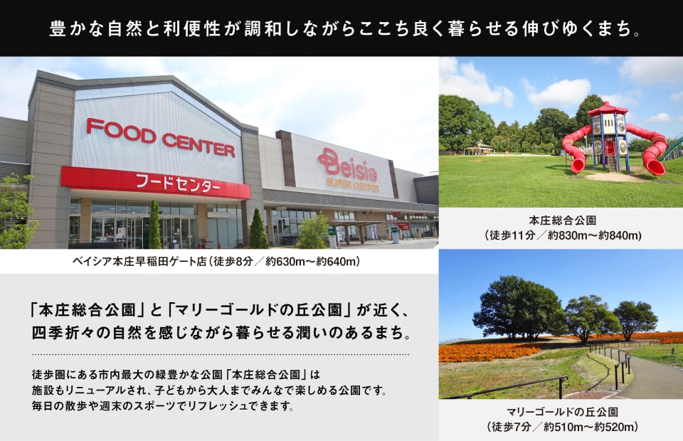 多彩なお店が入る「ベイシア本庄早稲田ゲート店」が徒歩圏にあるので楽しいお買い物ができます。スーパーやホームセンター、書店、さまざまな飲食店で賑わう施設が普段使いできるロケーション。