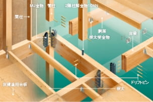 「シャーウッドプレミアム構造材」の採用、専用設計のオリジナル構造用金物を用いた「MJ接合システム」、「基礎ダイレクトジョイント」など、シャーウッドは柔軟な発想と科学的視点による独自の構法を進化させてきました。高い耐震性と空間創造力を両立させ、確かな安全性を確保しながら、より自由な空間づくりを可能にします。