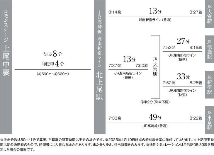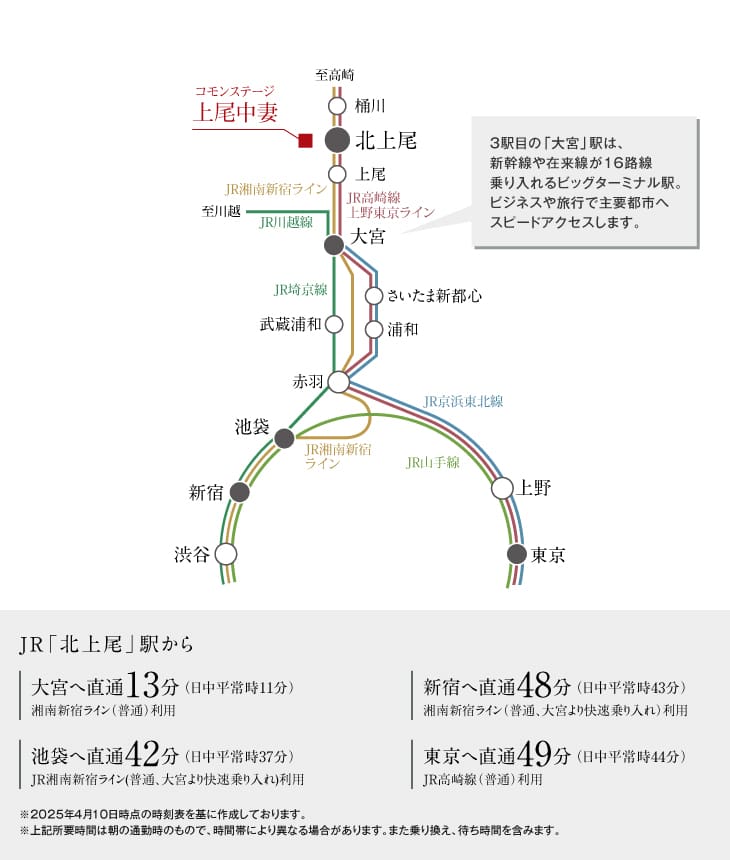 「北上尾」駅から湘南新宿ラインと上野東京ラインの2路線が利用可能で、山手線の東西の主要駅へダイレクトにアクセスします。