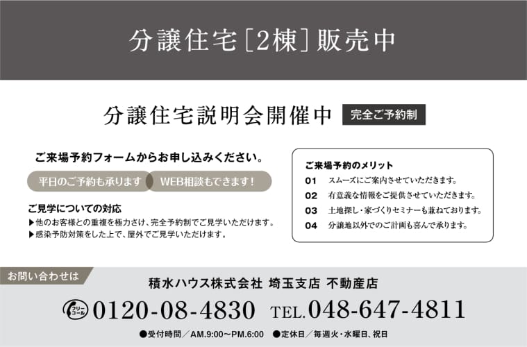 積水ハウス株式会社 埼玉支店定休日:火曜日、水曜日及び祝日 営業時間:9:00~18:00