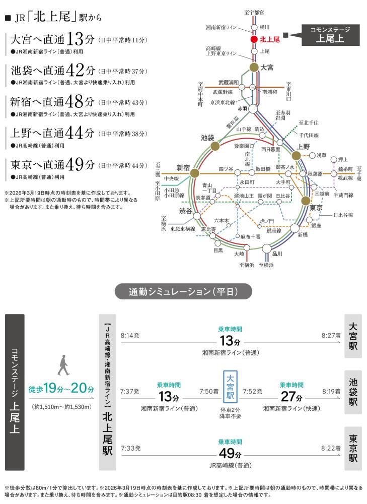 ![]() JR「北上尾」駅から都心の主要駅へ乗り換えなしの通勤・通学が可能。湘南新宿ラインと上野東京ラインが利用でき、山手線の東西の主要駅に直結します。3駅目の「大宮」駅は、新幹線や在来線が16路線乗り入れるビッグターミナル駅。ビジネスやレジャーで各地へスピードアクセスします。●JR「北上尾」駅(約1510m〜約1530m) |