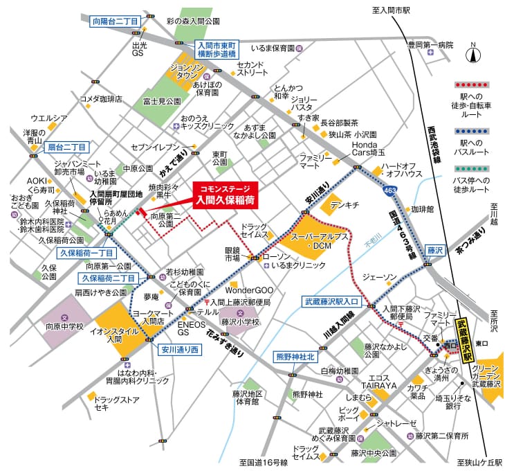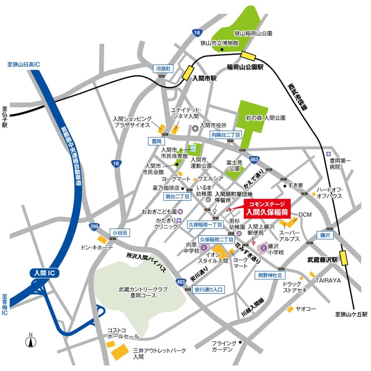 周辺には、ショッピングモールや大きな公園があり、車での移動は、幹線道路の「所沢入間バイパス」や「国道16号線」で各エリアに快適にアクセスできます。